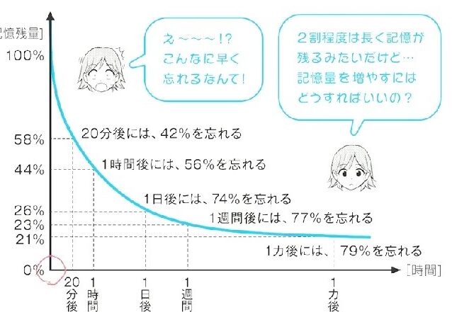 - 一定の間隔で復習する。時間の経過に合わせて復習の頻度を変更し、エビングハウスの忘却曲線に基づく復習を行います。