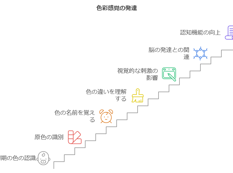 - 4歳での拡張: 色を名前で呼べるようになり、基本的な色の分類ができる。