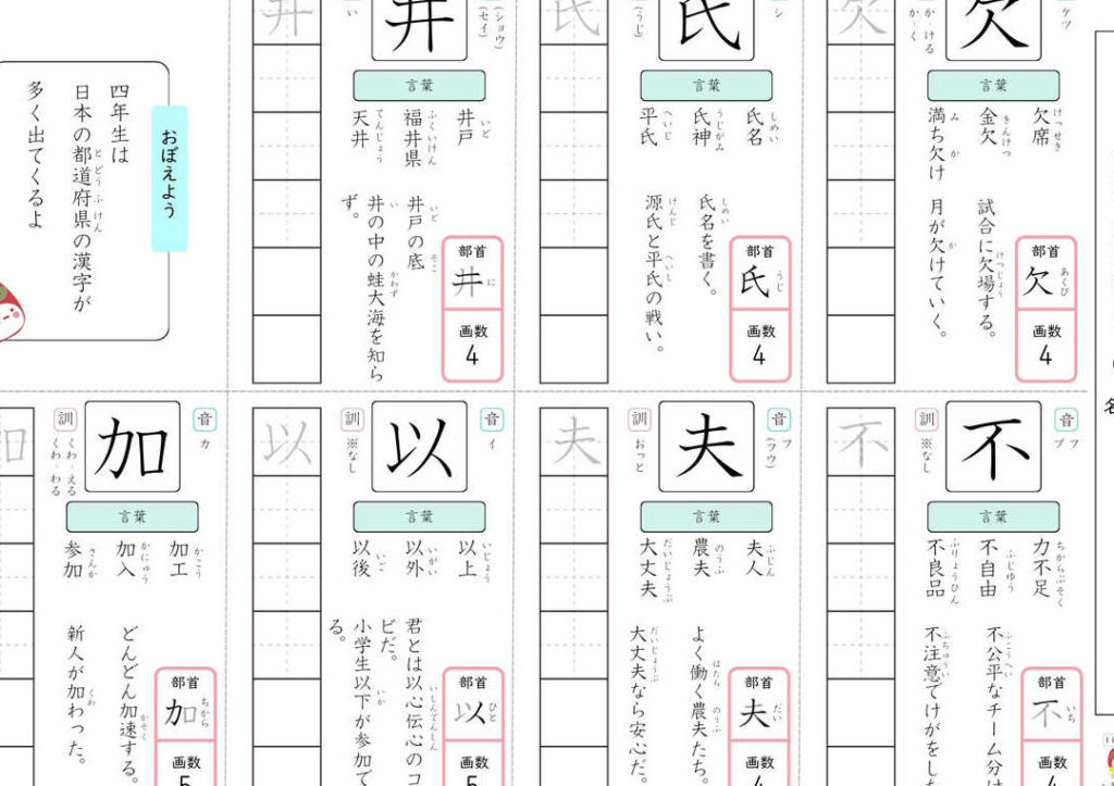 - 3年生: 漢字の学習が始まり、簡単な歴史や地理に触れます。