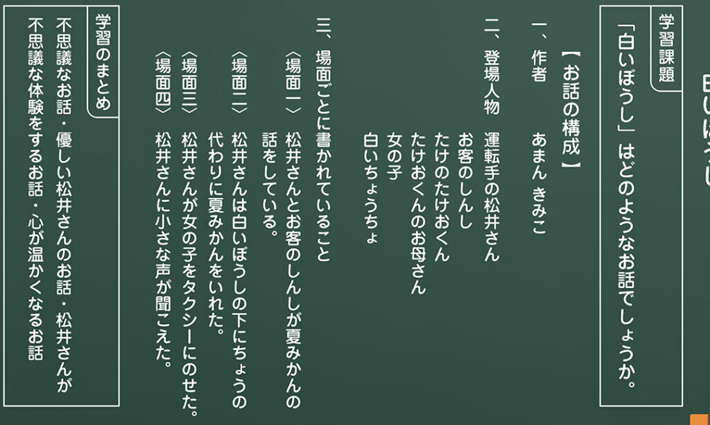 教科書に出てくる「白」に関して質問をします。例えば、「この絵の中の白は何を表しているの?」と問いかけます。