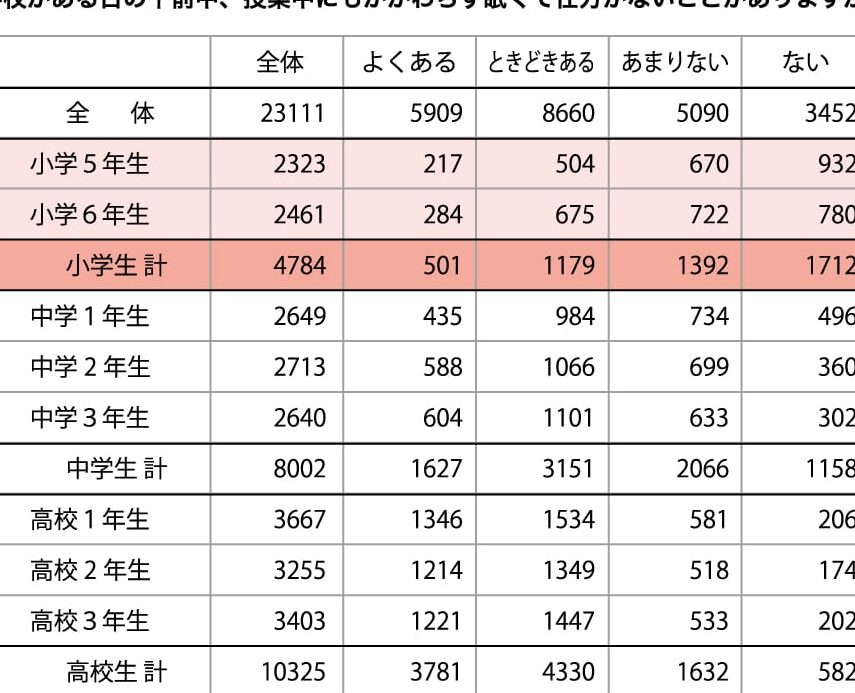 - 5年生: 睡眠不足の影響について詳細に学習。身体への影響や集中力の低下などを授業で取り上げる。