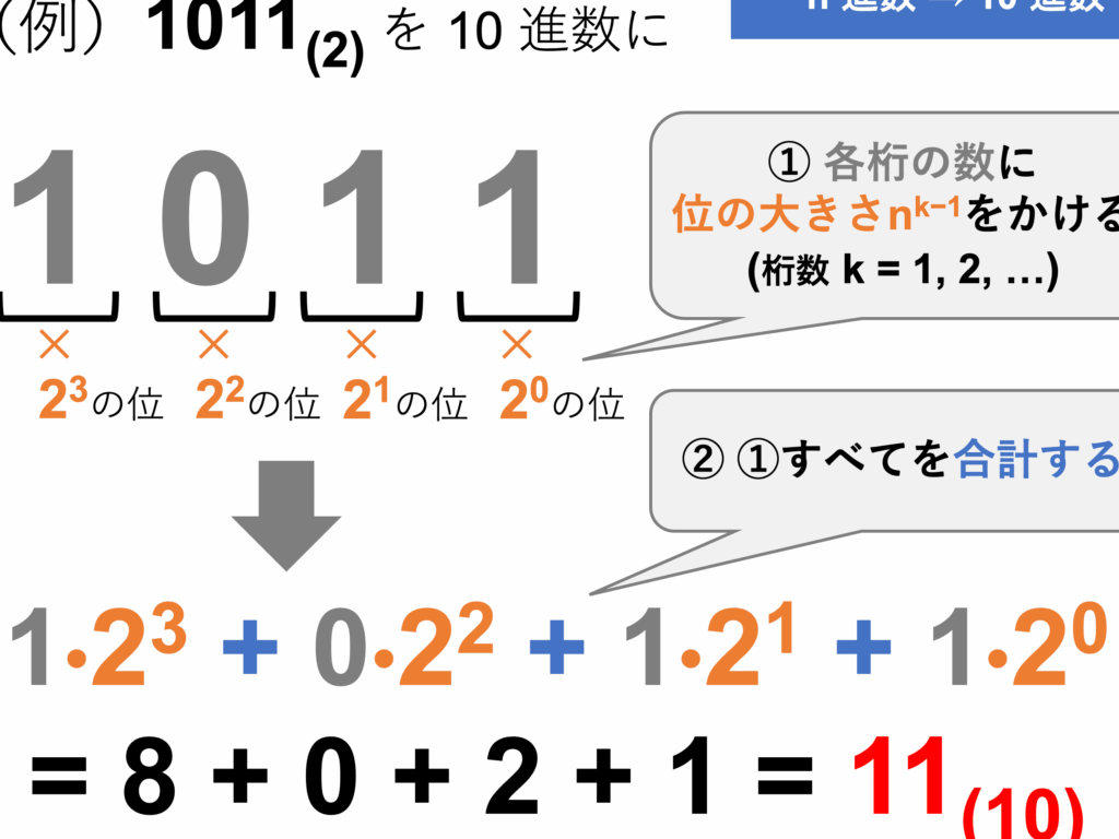 n進法は、数を表すときに使う基数のことを指します。基数が2の場合、これは二進法であり、0と1の二つの数字を用いて全ての数を表現します。基数が10の場合は十進法となり、0から9までの数字を使います。具体的には、n進法では次のことが可能です: