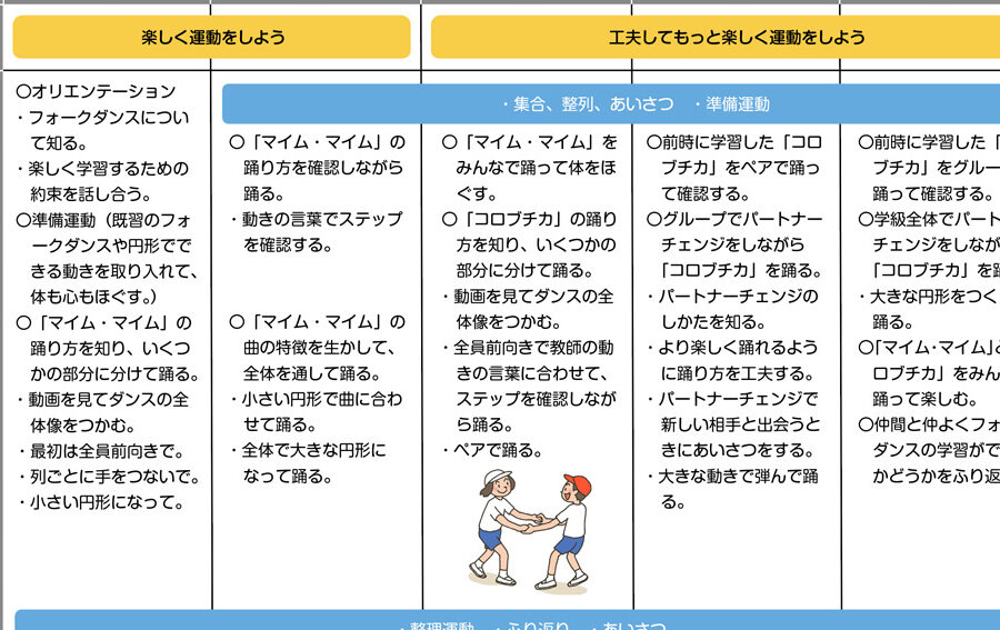 - 5年生: 資料を用いた振り付けの学習や、オリジナルの踊りを創作することも行う。