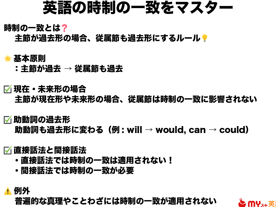 時制の一致は、文全体の意味を正確に伝えるために欠かせない要素です。一致が崩れると、文が不明瞭になり、誤解を招くことがあります。以下の点に注意すると、時制の一致ができるようになります。