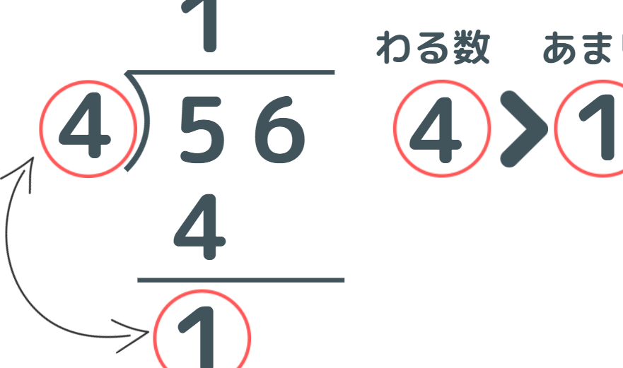 - 再度計算: 4が3の中に何回入るかを考え、0回です。