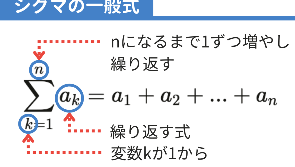 - シグマの内容を定義する。 合計対象の数式や数列を示します。