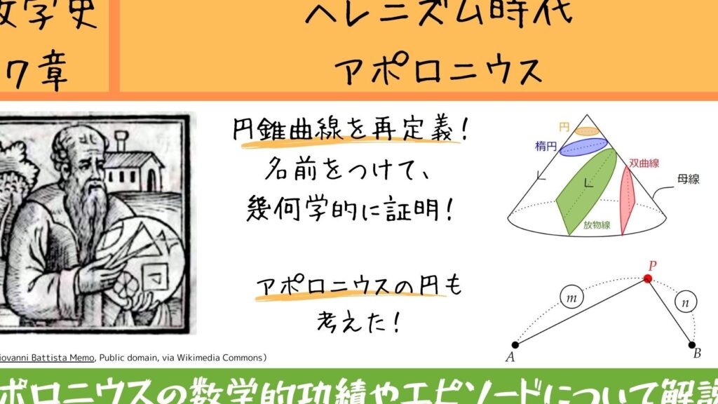 アポロニウスの円は、古代ギリシャの数学者アポロニウスにちなんで名付けられました。彼は円の研究を通じて、円と点の関係におけるさまざまな性質を発見しました。この研究は、後の幾何学の発展に大きく寄与しました。