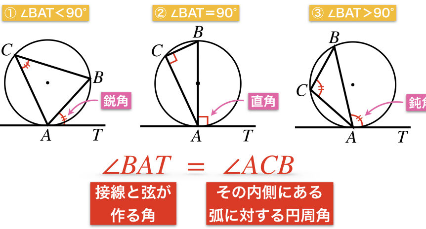 接線と弦の作る角の定理は、次のように定義されます。接線の交点から円の中心を通る弦を描くと、接線と弦の交点で形成される角は、弦が描く角と等しいというものです。この関係は、以下のような形でまとめられます。
