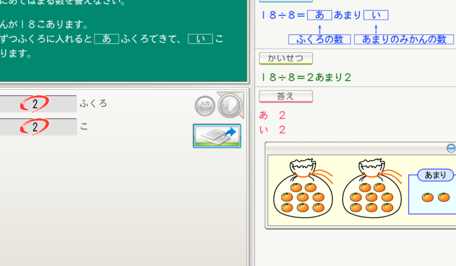 - 課題:あまりのある割り算を実生活のシナリオに応用する課題が与えられ、問題解決能力を育成する。