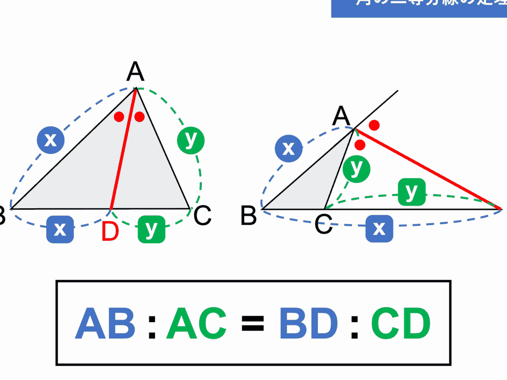 - 外部の点に対しても、角の二等分線の性質が適用される。